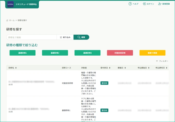 研修一覧ページの画面