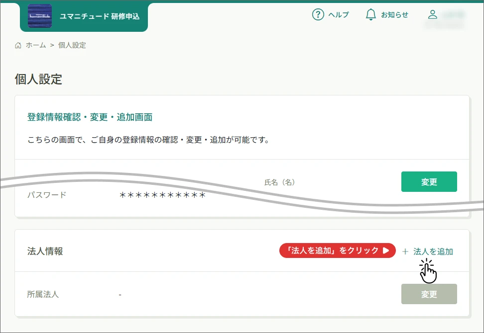 「法人登録申請」ページを開く「個人設定」ページの「法人情報」ブロックにある「+法人を追加」をクリックしてください。