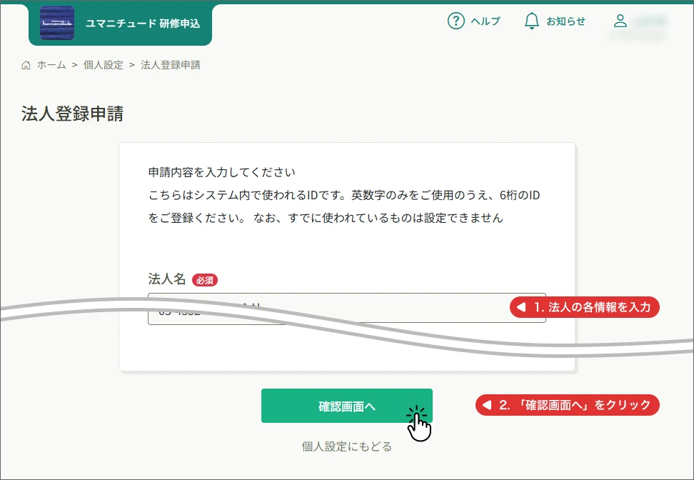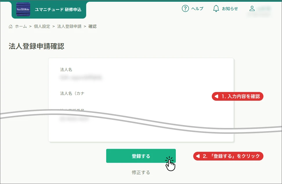 - 「法人登録申請確認」ページで、入力内容を確認してください。