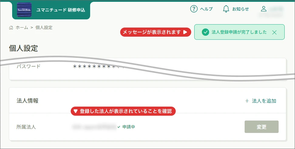 - 画面右上に「法人登録申請が完了しました」というメッセージが表示されます。